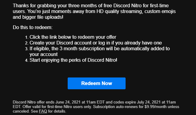 Vous ne rêvez pas, Epic Games offre bel et bien 3 mois de Discord Nitro à ses utilisateurs. Et pour profiter de cette offre unique, vous n’avez qu’à vous rendre sur l’Epic launcher et de la réclamer. Vous n’avez plus qu’à vous rendre sur votre adresse email et cliquer sur « Redeem Now« . Malheureusement, un moyen de paiement vous sera également demandé : vous aurez le choix entre crédit ou Paybal. Et comme à chaque fois dans ce genre de situations, nous vous recommandons fortement d’utiliser Paypal afin d’éviter de mauvaises surprises.