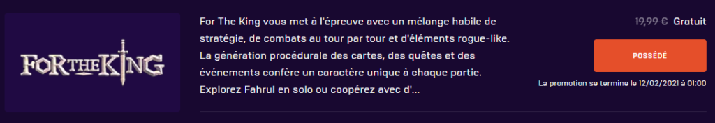 Pour les habitués, vous savez déjà où vous rendre afin de récupérer votre copie gratuite du jeu. Pour les autres, rendez-vous sur le launcher d’Epic Games et connectez-vous. Une fois connecté, dirigez vous vers l’onglet de la boutique et descendez jusqu’à atteindre la catégorie « Jeux gratuits ». Cliquez ensuite sur le bouton « Obtenir » et voilà, For The King fait désormais partie de votre librairie.