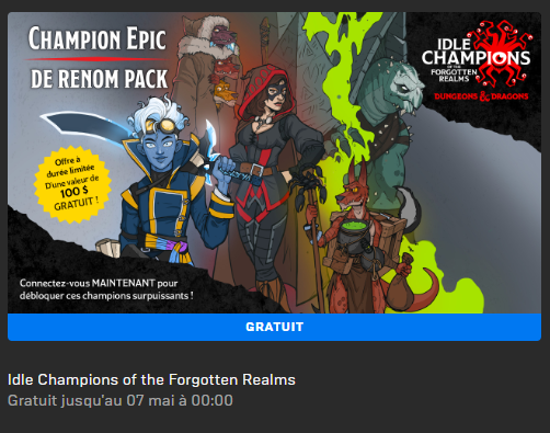 C’est avec un léger retard que nous vous présentons le jeu gratuit de la semaine. Offert par Epic Games dans le cadre de sa stratégie marketing, Idle Champions of the Forgotten Realms peut être récupéré gratuitement sur l’Epic Store.