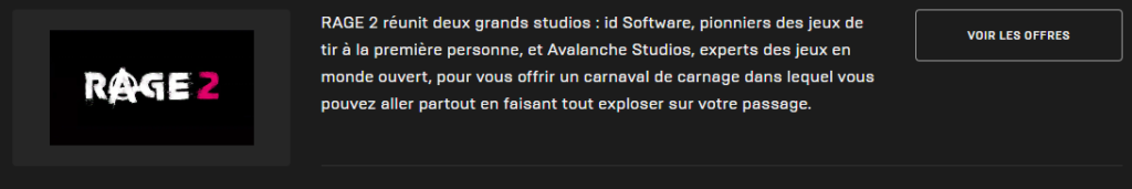 Pour les habitués, vous savez déjà où vous rendre afin de récupérer votre copie gratuite du jeu. Pour les autres, rendez-vous sur le launcher d’Epic Games et connectez-vous. Une fois connecté, dirigez vous vers l’onglet de la boutique et descendez jusqu’à atteindre la catégorie « Jeux gratuits ». Cliquez ensuite sur le bouton « Obtenir » et voilà, Rage 2 fait désormais partie de votre librairie.