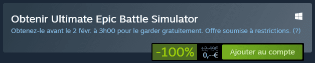 Vous ne rêvez pas, le jeu (ou programme) est bel et bien offert sur Steam ! Vous pouvez récupérer Ultimate Epic Battle Simulator en vous rendant sur sa page Steam. Cette offre étant limitée dans le temps, nous vous conseillons vivement de vous dépêcher. Vous avez jusqu’au 02 février 2021 pour le récupérer gratuitement. Une fois cette période dépassée, il vous faudra dépenser coquette somme de 12, 49 euros.